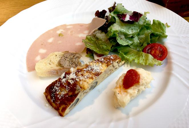 前菜は、サラダ(たまねぎドレッシング)、オムレツ、ハム、パテ、ポテトサラダ、それにバケットがついてきました。