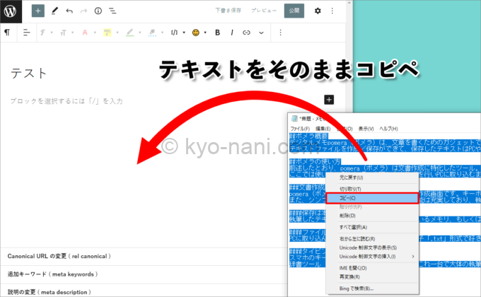 辞書機能を使う時。後述しますがpomera(ポメラ)の辞書は、辞書の内容をコピーして作成中の文章にペーストできる機能があります。