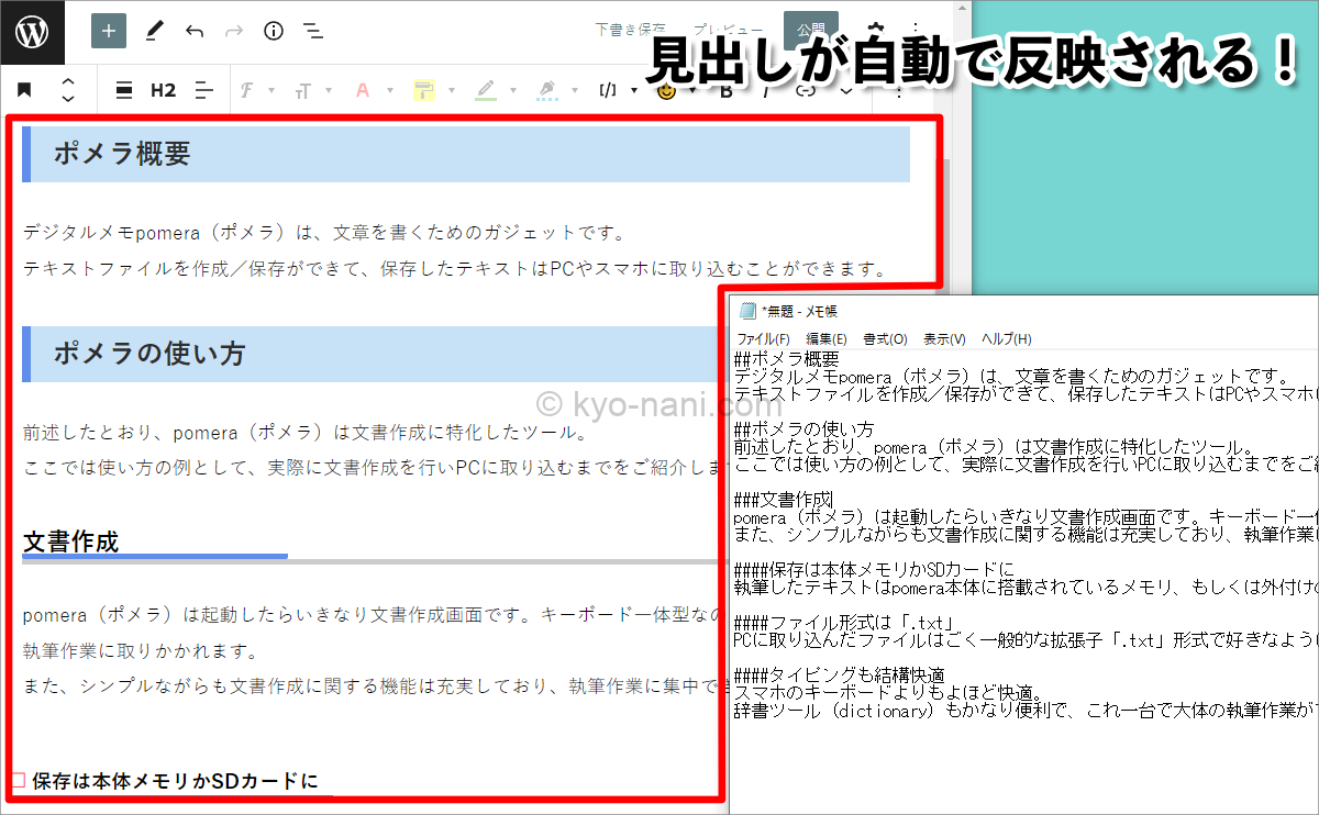 わざわざ「#」を消してh2などに装飾して…なんて手間はいりません。ポメラで存分に構成を確認しながら作成できて、装飾の手間を省いてシームレスにWordPressで作業の続きができるんです。