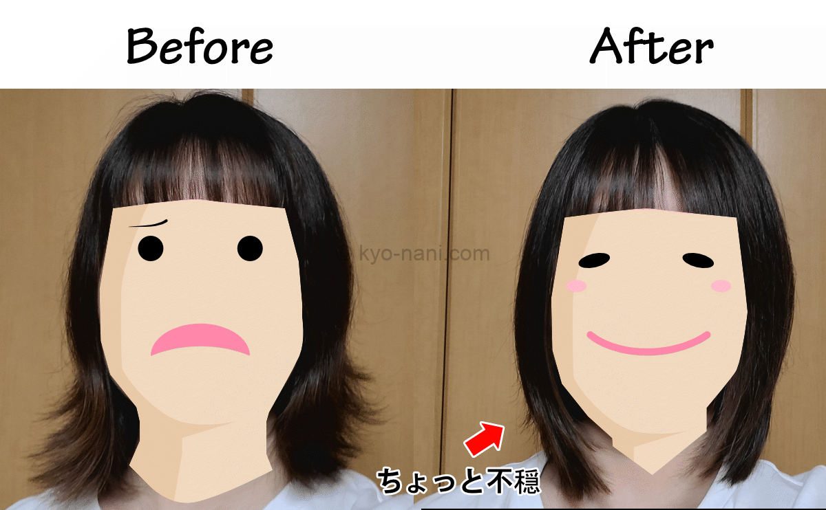 ひどい外ハネの筆者たしろが使ってみたところ、意図せずとも毛先が内巻き気味のナチュラルストレートに仕上がりました。良く言えばナチュラルストレート、わるく言えばパワー不足といった印象です。