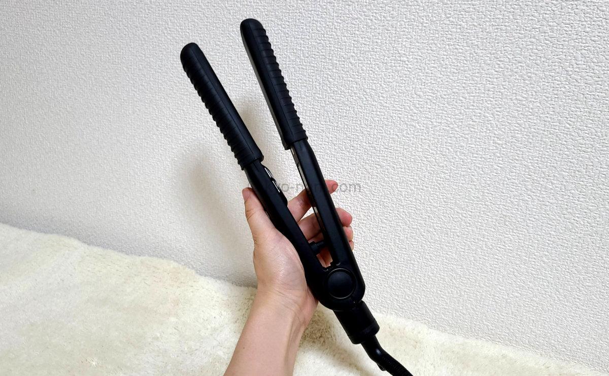 巻き髪を作るには良い分厚さなんですが、根元からまっすぐにしたい場合はこの分厚さが仇となって、肝心の根元を挟むのがめちゃくちゃむずかしい…。