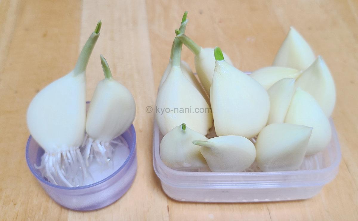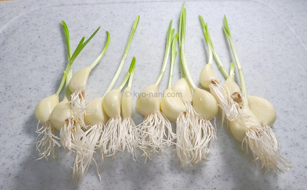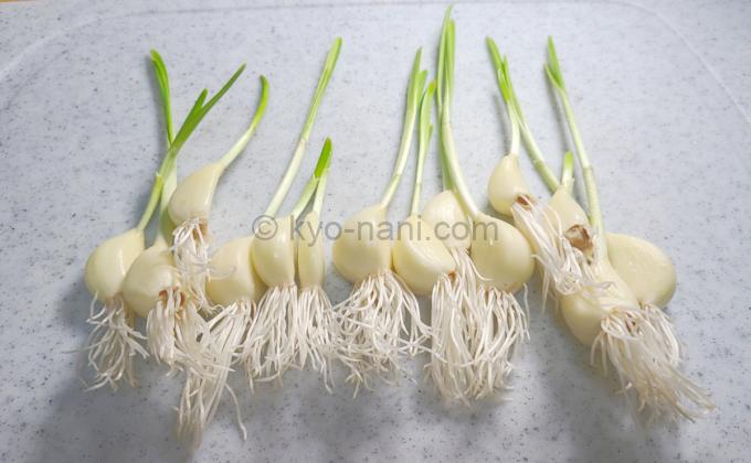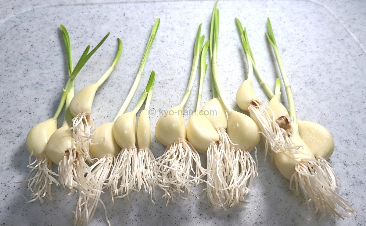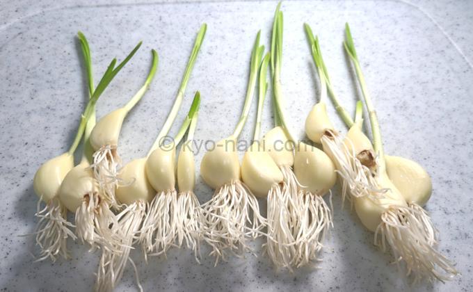 冷蔵庫にひとかけ放置してた時になんかに意図せず芽が出ていることがありますが、発芽ニンニクは意図して芽と根を伸ばした状態のものです。