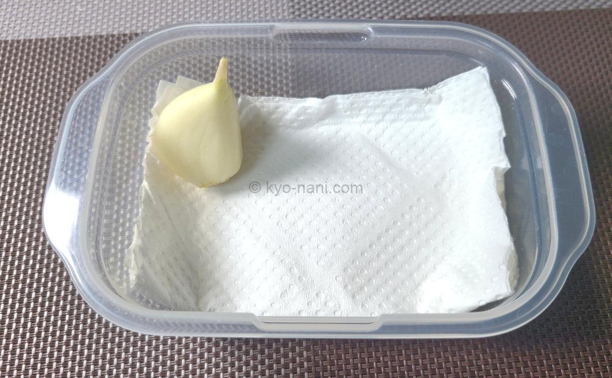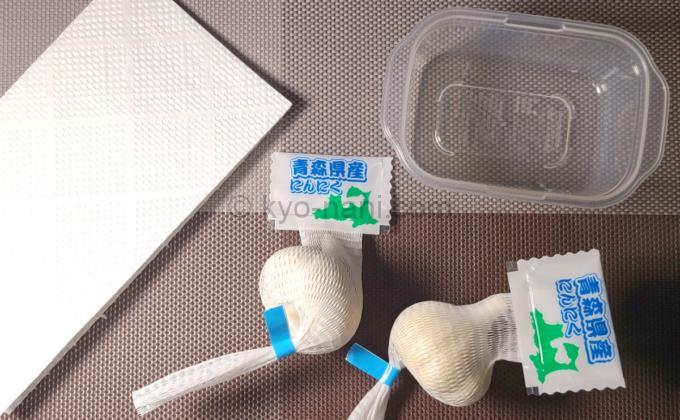 画像:必要な材料や道具の写真(キッチンペーパー、タッパー、にんにく)