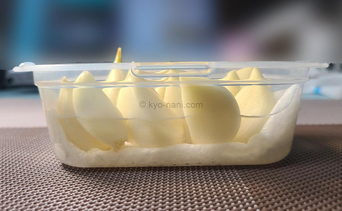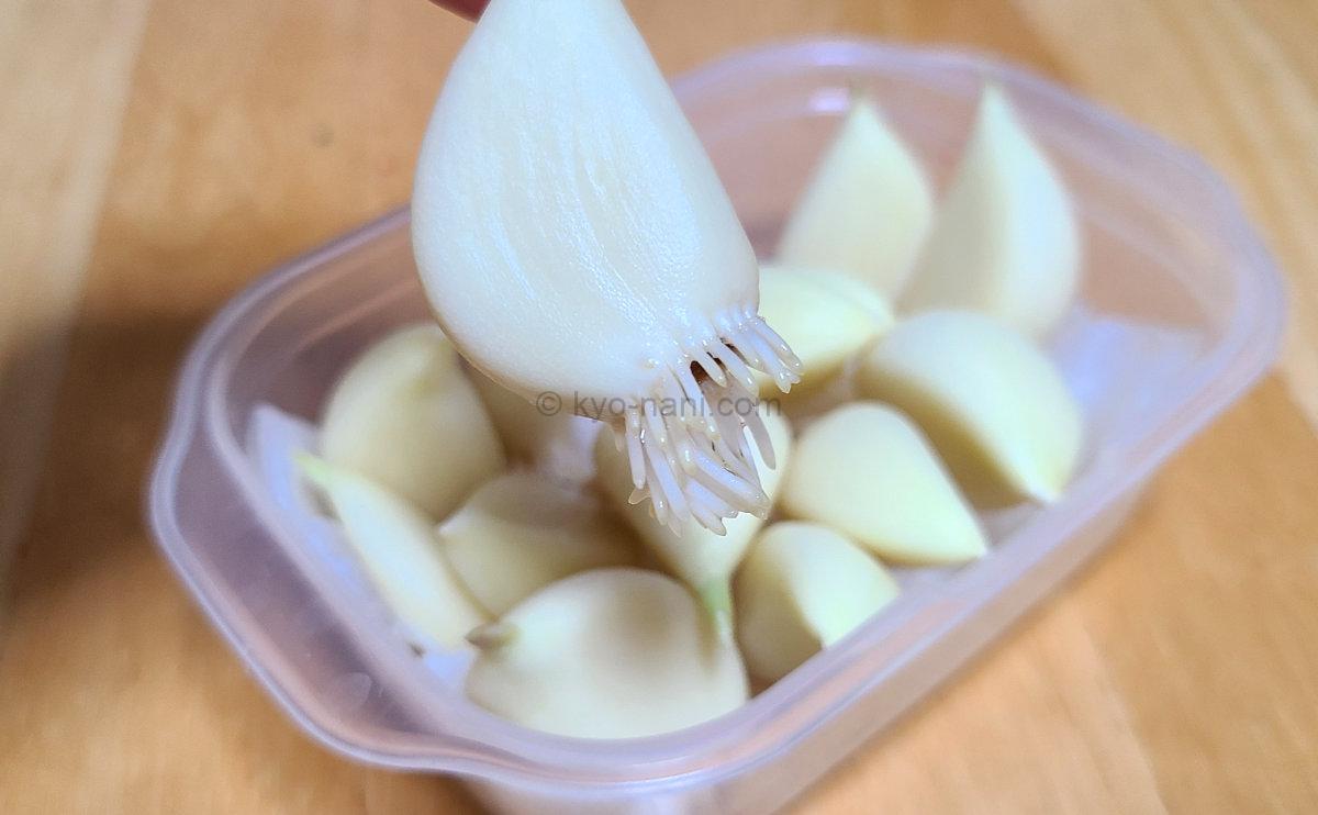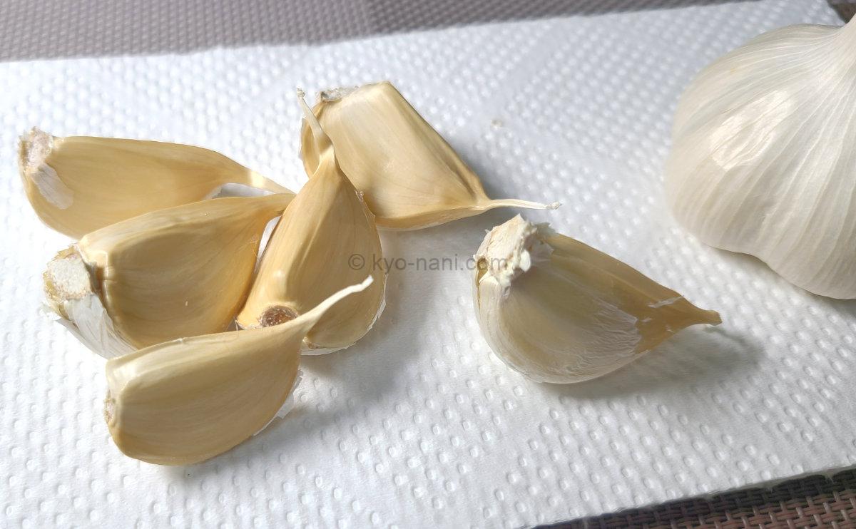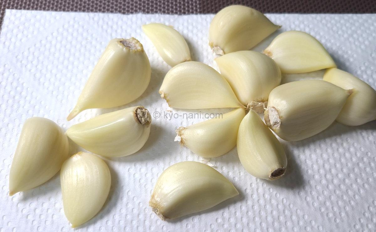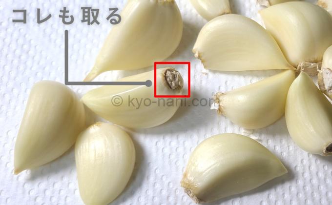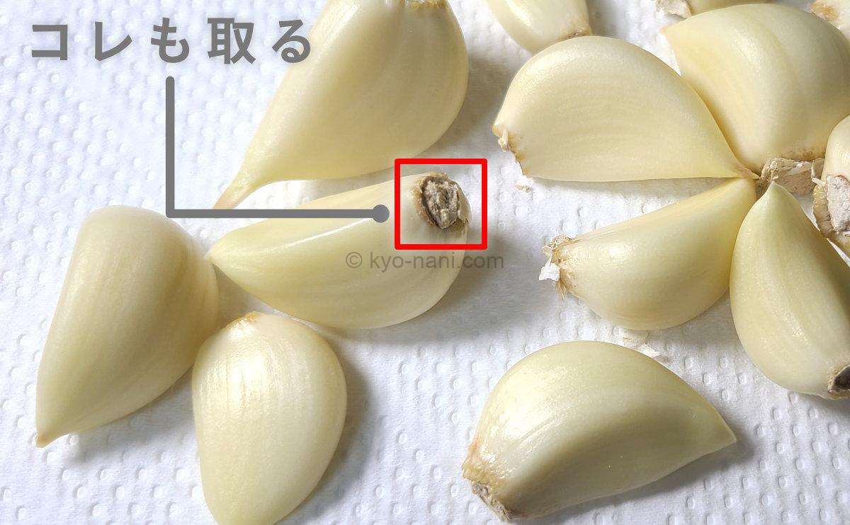 画像:にんにくの粒から皮をむいた状態の写真に次の注釈文が添えられています。「粒の底の硬いやつも取る」