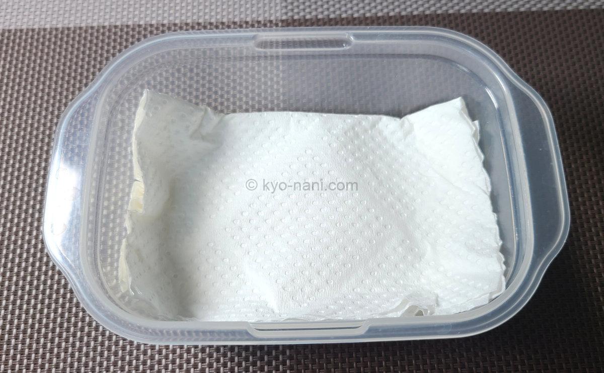画像:タッパーの器にキッチンペーパーを折り込んで敷いています