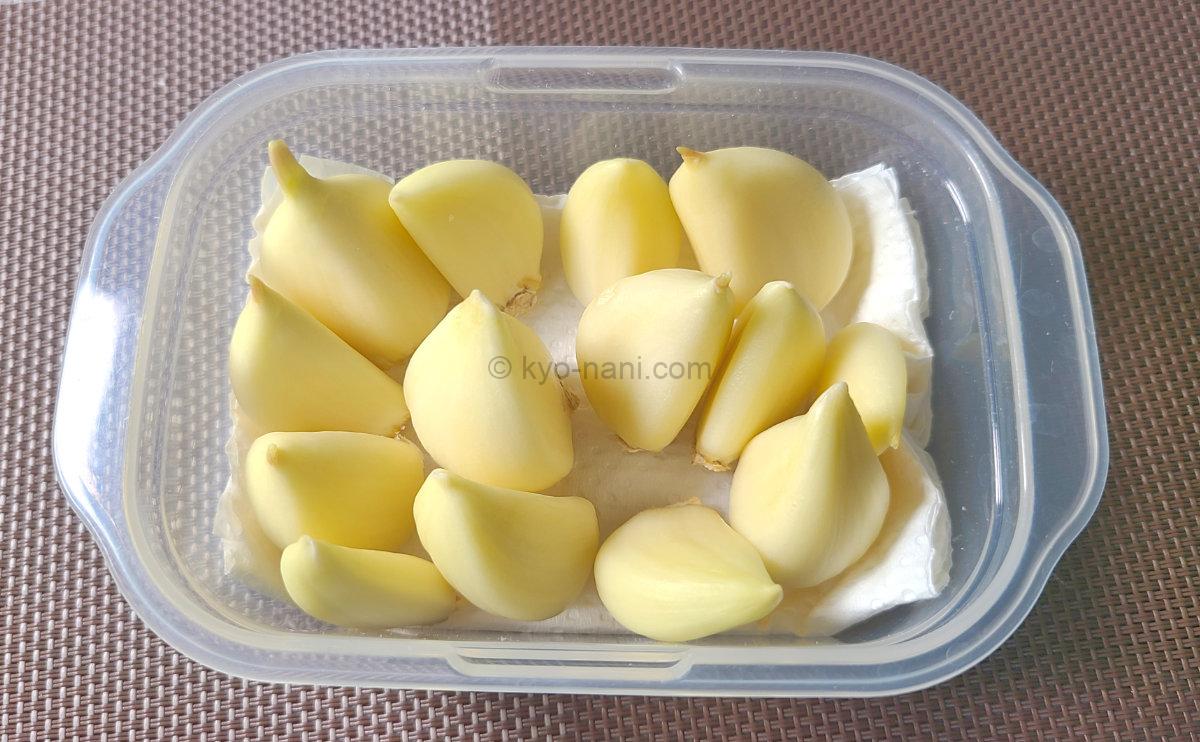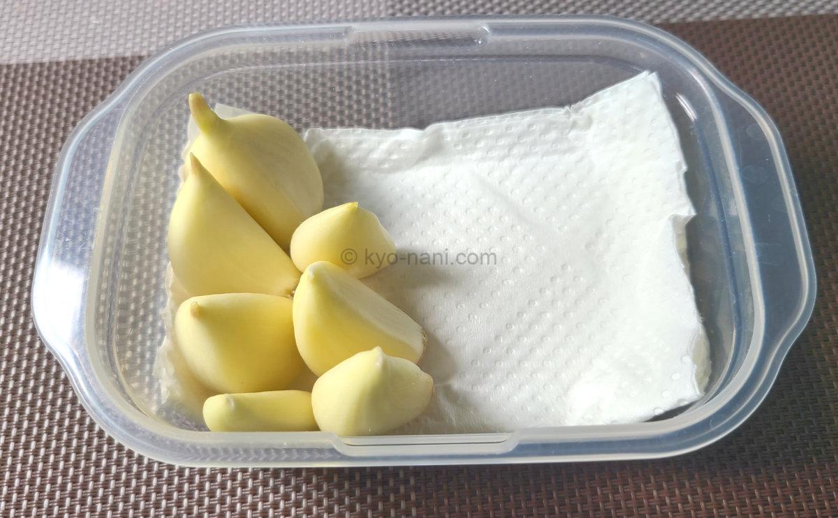 画像:キッチンペーパーを敷いた器にニンニクの粒を詰め、にんにくの底が浸る程度に水を入れた状態