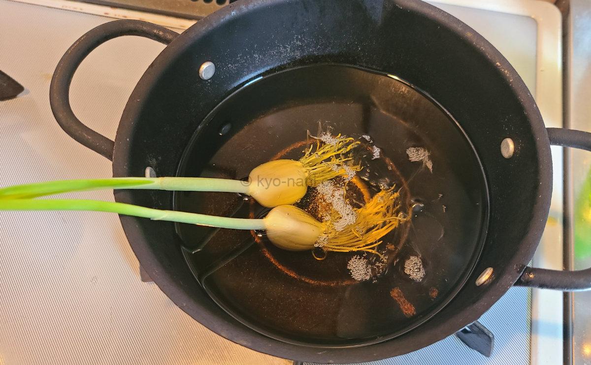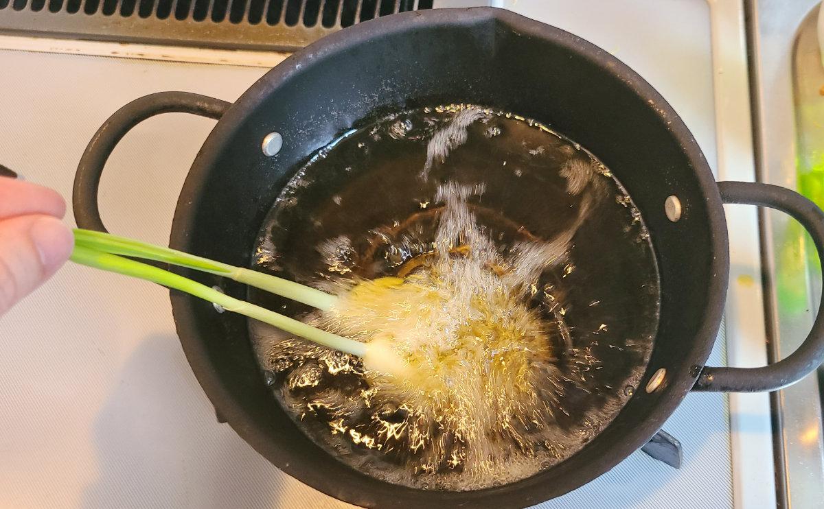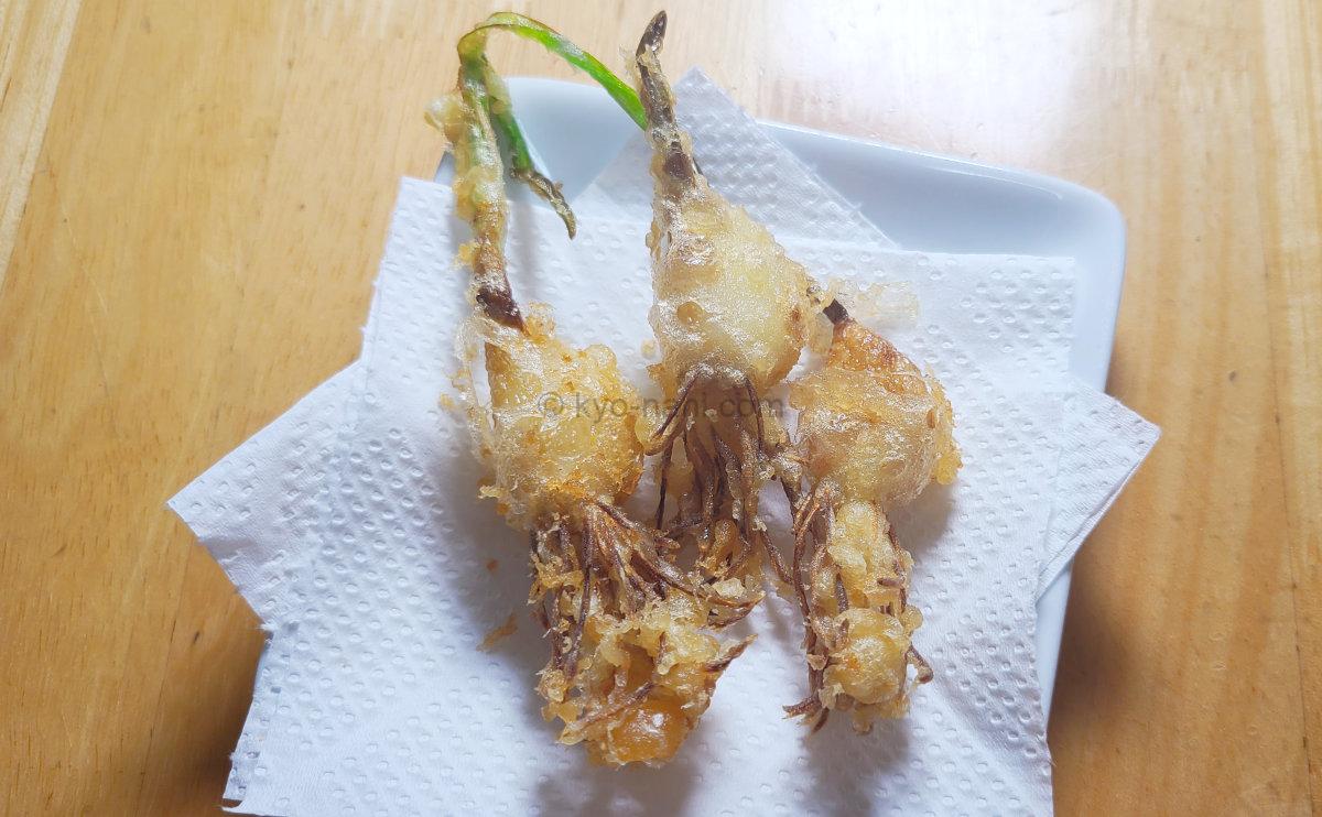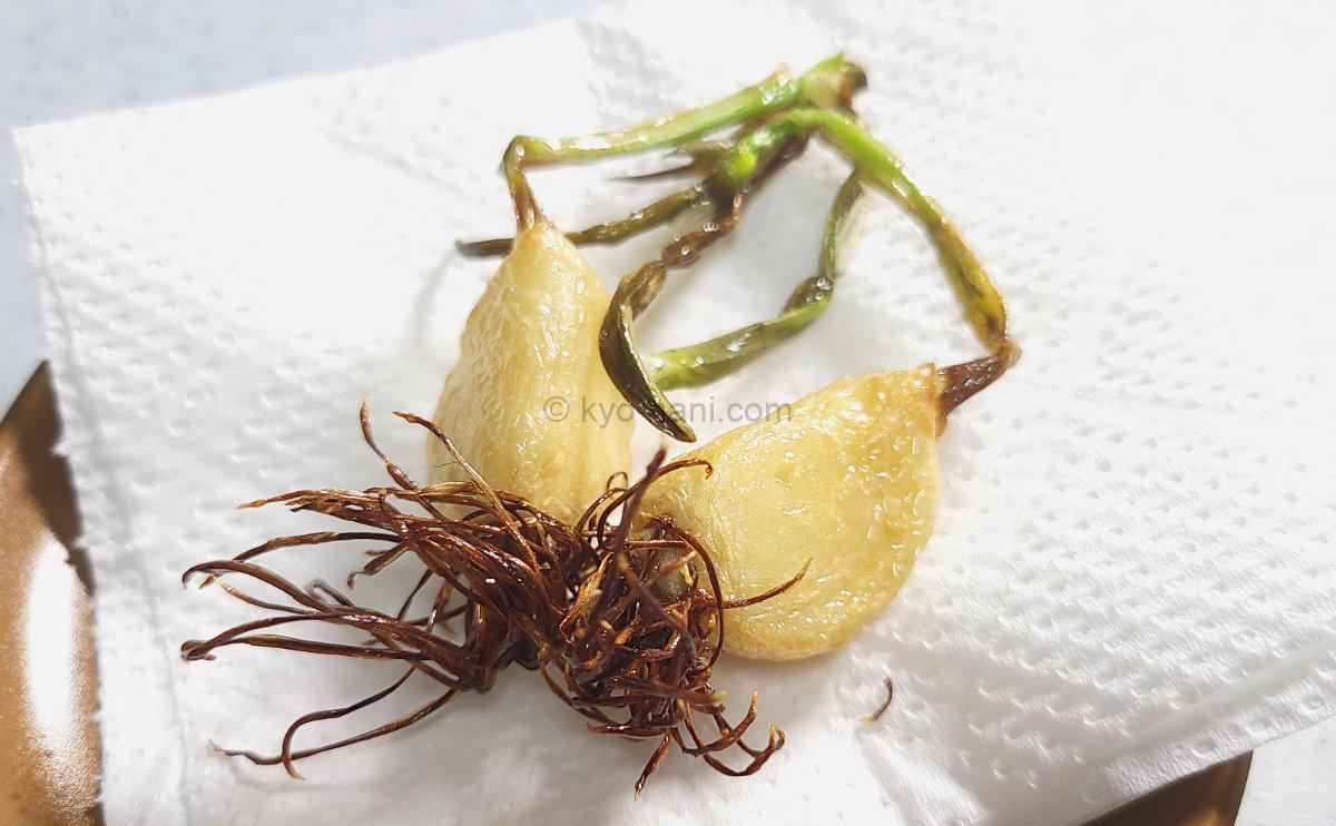 てなわけで今回筆者は芽を掴んで時間差で揚げましたが持ったままが結構めんどかったので切ってしまったほうがいいなと感じました。