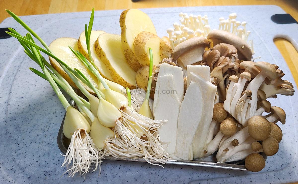 写真:調理用のバットに並べられた天ぷらの材料(発芽にんにく、じゃがいも、エリンギなどのきのこ類。発芽にんにく以外はカット済み)
