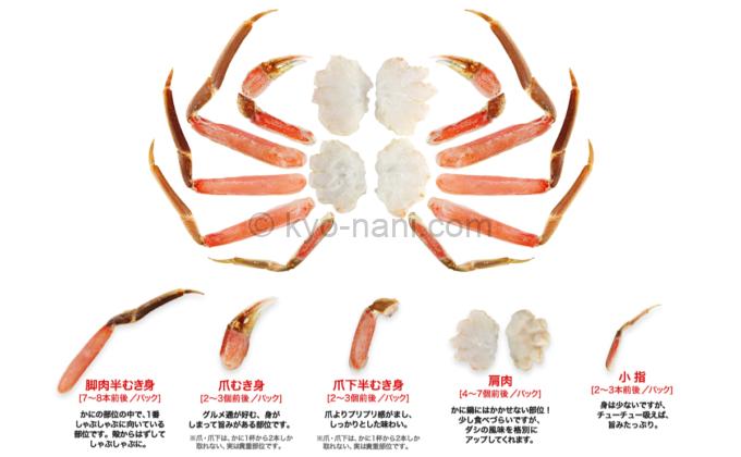 もしくは用途(カニしゃぶ用や刺身用など) - 状態(ボイル/生むき身/半むき身など)