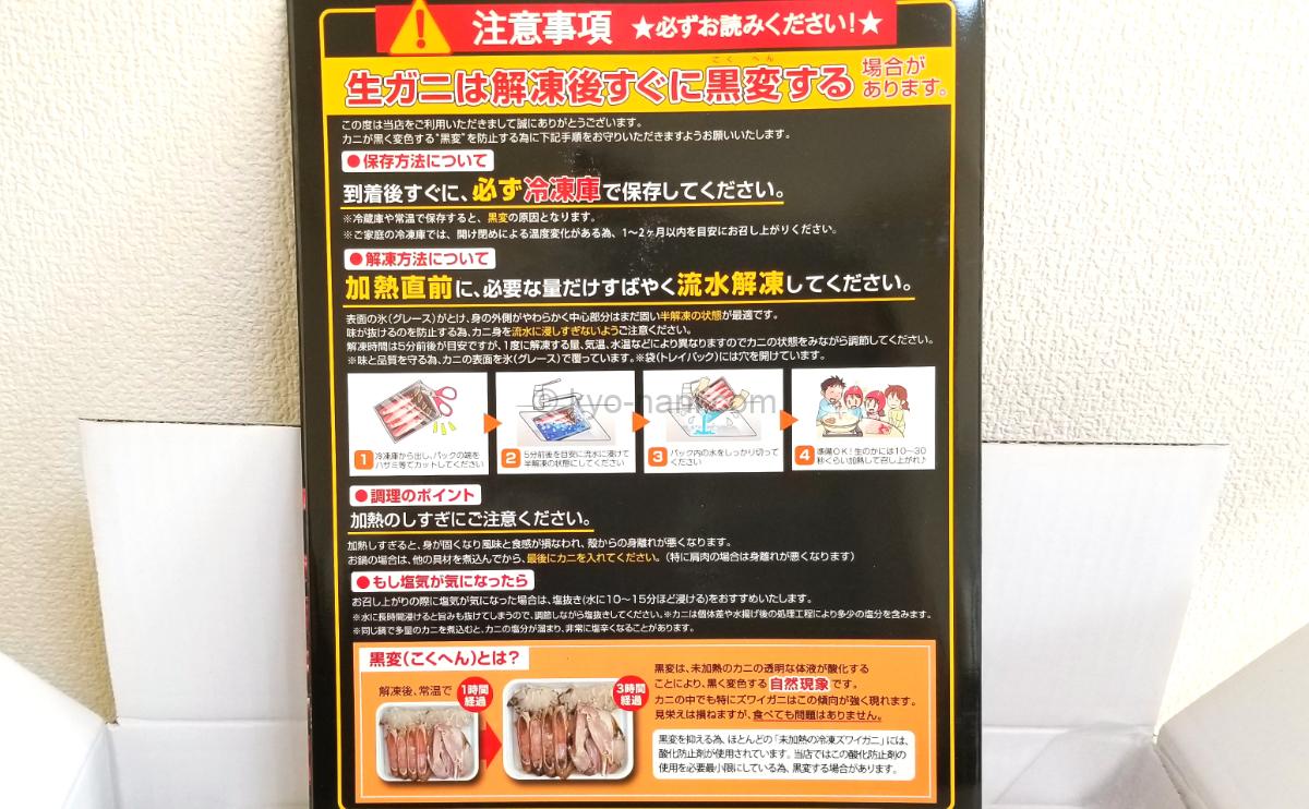 このパンフレットのおかげで、解凍方法から美味しくいただくまで、素人でも安心してカニを扱うことができました。