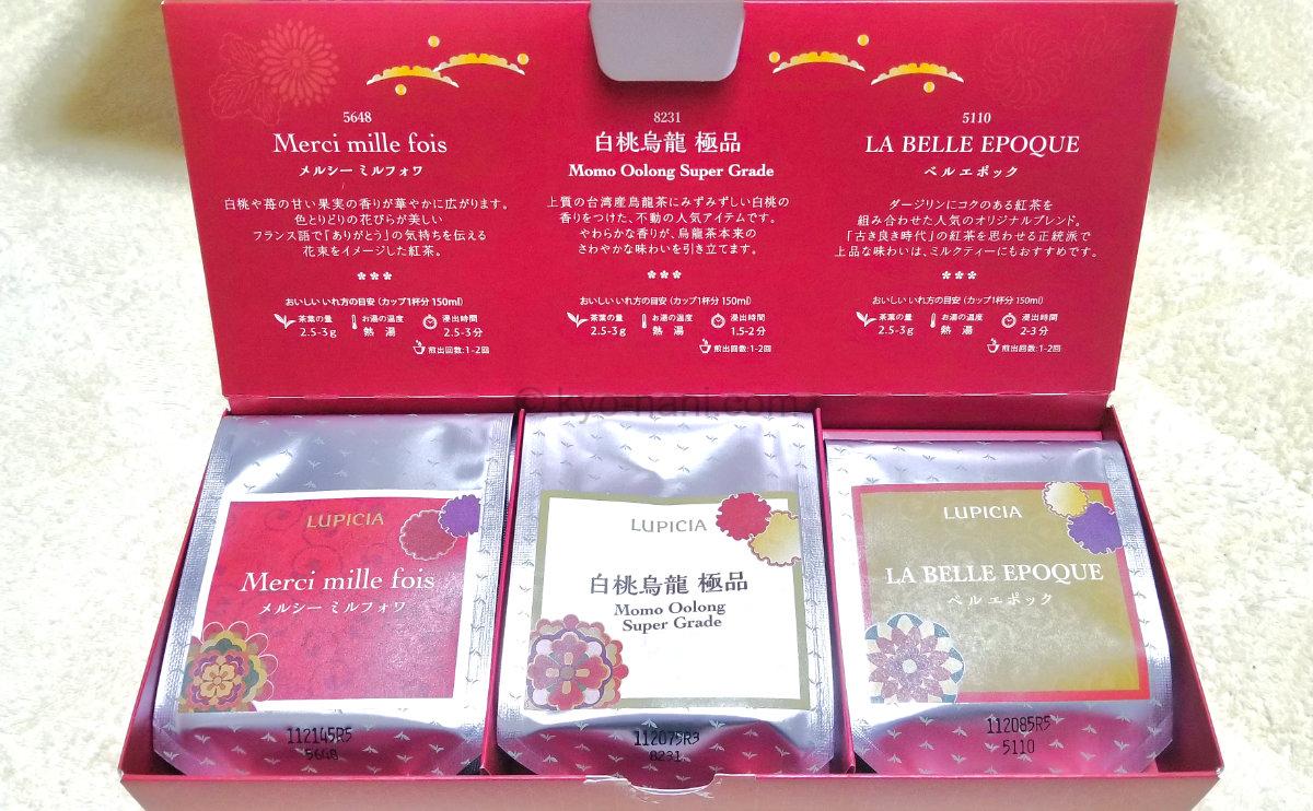 LUPICIA(ルピシア)のフレーバーティーの中でも特に人気のお茶をセレクトした、おまけと言うにはかなり豪華なセットです。こちらも一つずつ紹介しますね。