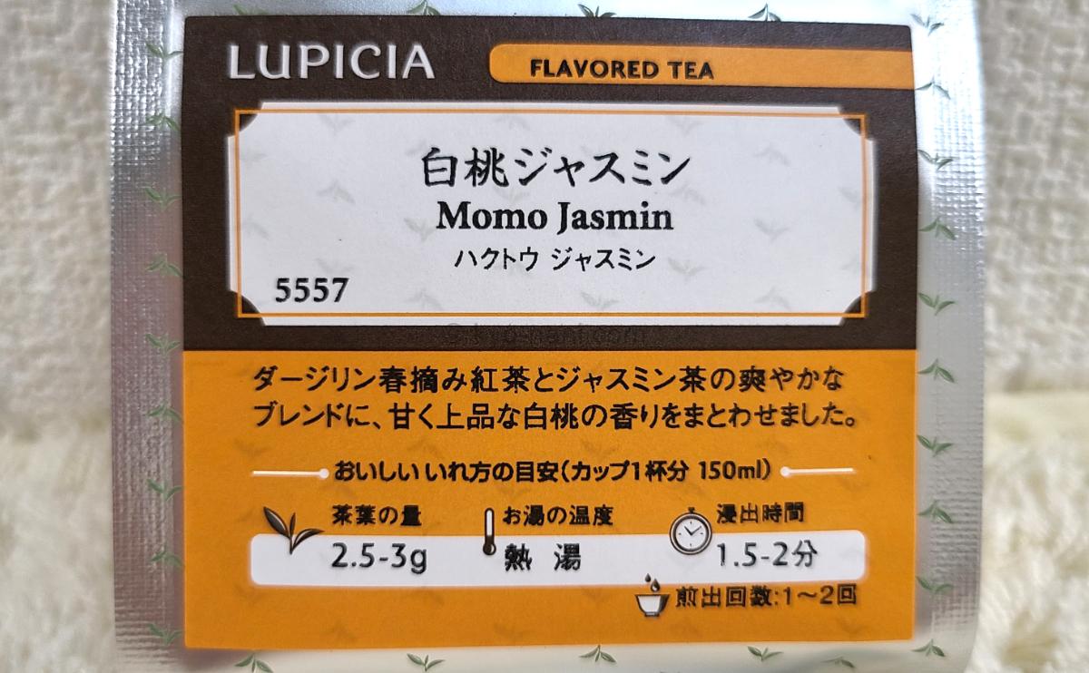 ルピシア人気の白桃シリーズの、ジャスミンティー版。と思ってたんですがラベルを良く見るとダージリン春摘みとジャスミンティーのブレンドって書いてますね!?