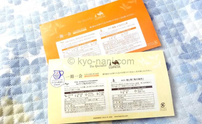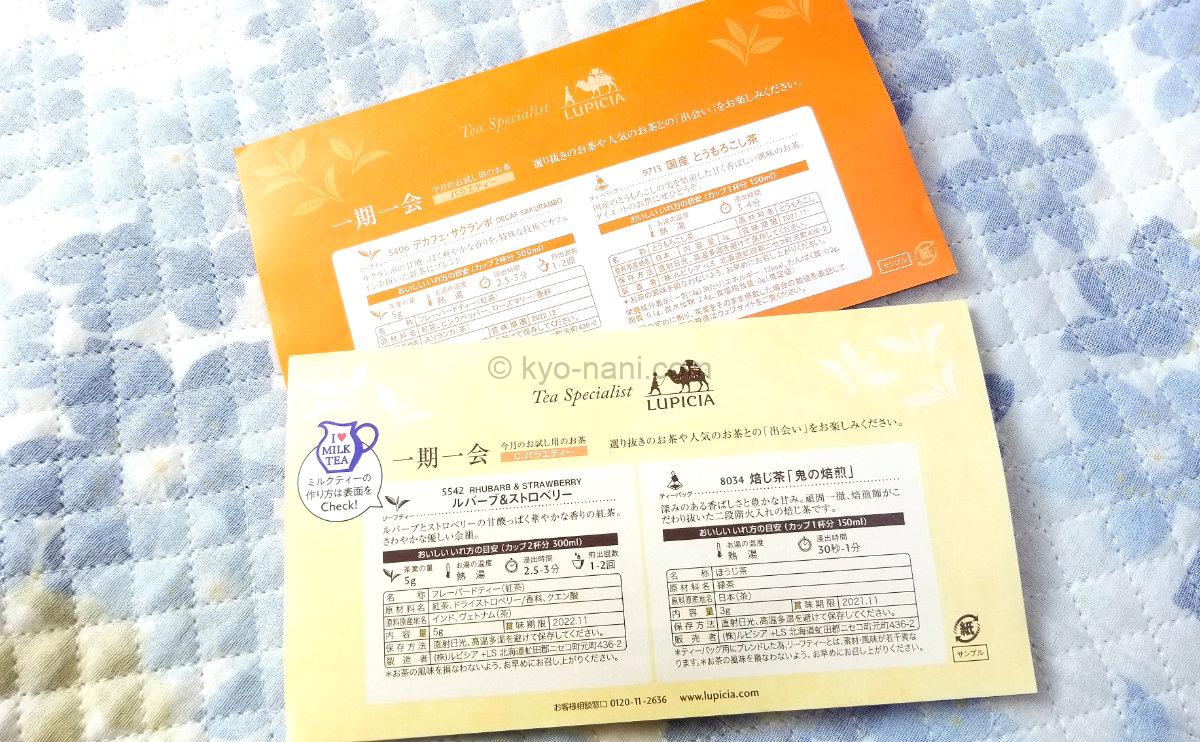 さらに、ルピシアだよりには毎回お茶のお試しとして、2種類のお茶のサンプルが付いています。ルピシアおすすめのお茶を毎月2種類試せるので、これまたお茶初心者にはめちゃくちゃ嬉しいおまけです。