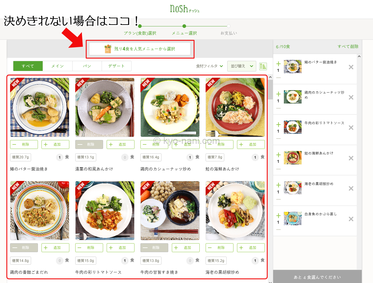 ナッシュはメニューを1食ずつ好きに選べるタイプの宅食なんですが、変更可能期限であればスキップと同様にメニューも変更が可能です。