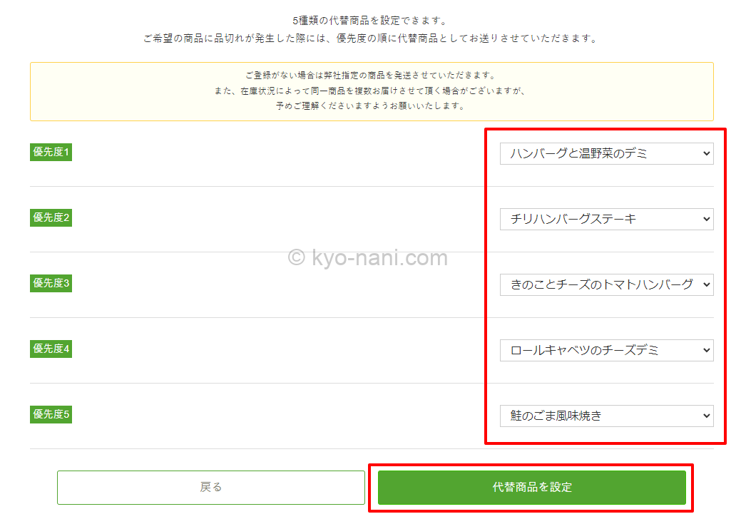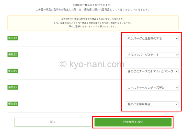 選べる品は5品。優先順位も決められるので、欠品時は確実に自分のチョイスしたメニューが代替品になるしくみ。