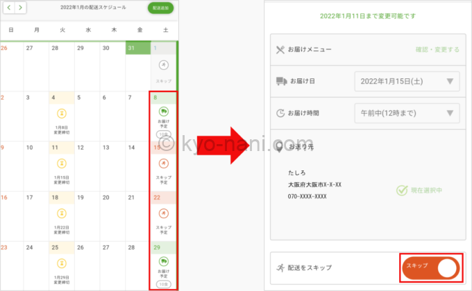 スキップの方法も簡単で、マイページにログインし、カレンダーからスキップスイッチをオンにするだけ。