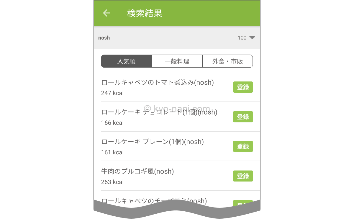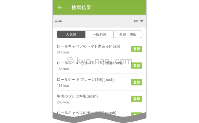 その日摂った食事(食材)を細かく登録しないといけないのですが、なんとnoshの全メニューに対応しており、メニュー名を検索して自動的にカロリーや栄養素が登録できちゃいます。