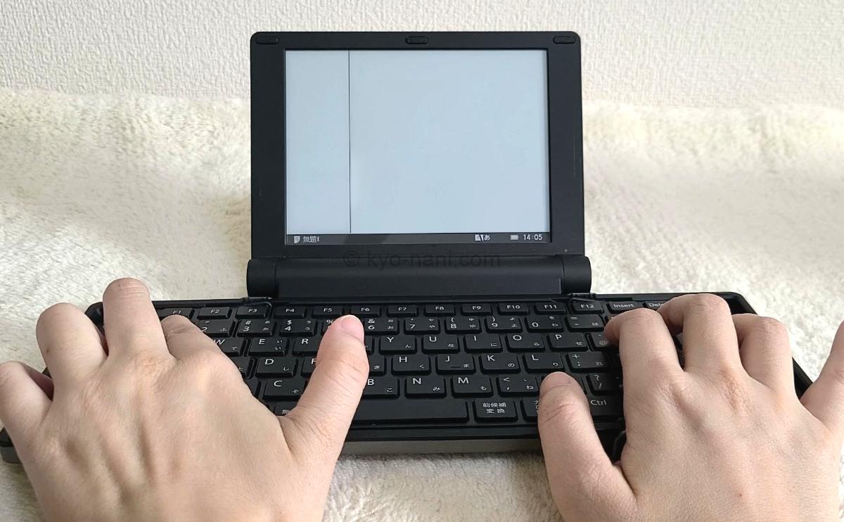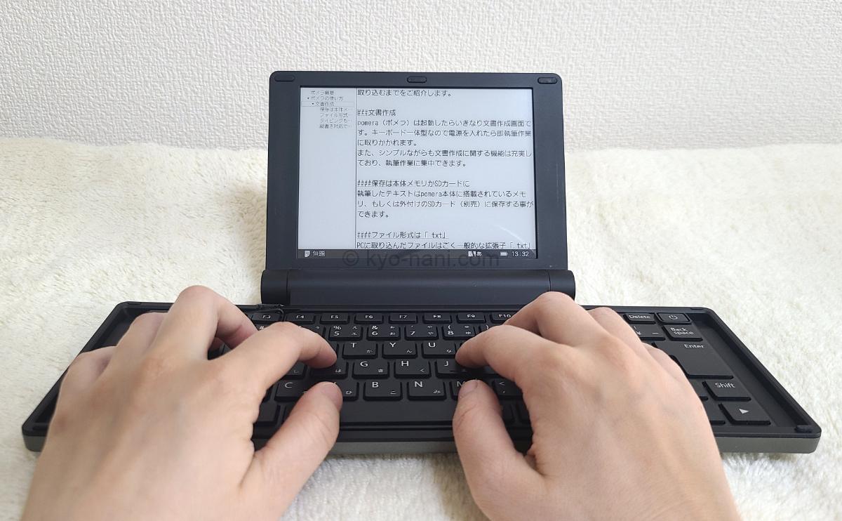 pomera(ポメラ)のキーボードをタイピングしている写真