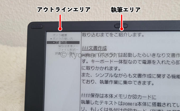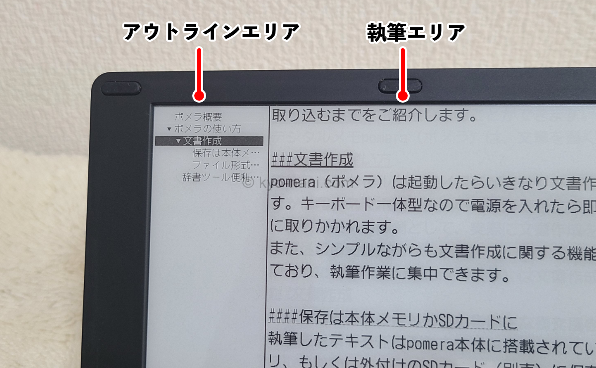 pomera(ポメラ)はアウトライン機能をONにすると、画面が分割されます