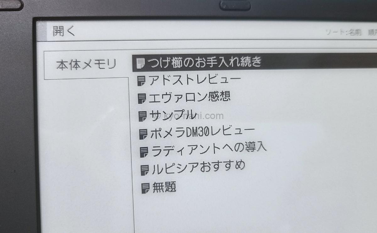 pomera(ポメラ)の本体フォルダの中。作成したテキストファイルがずらっと。
