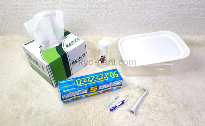 歯ブラシ、ラップはドラッグストアで買ったもの。容器はマックスバリュのキッチン用品コーナーで見つけたタッパーみたいなやつです。ティッシュやガーゼもドラッグストアやスーパーで揃います。