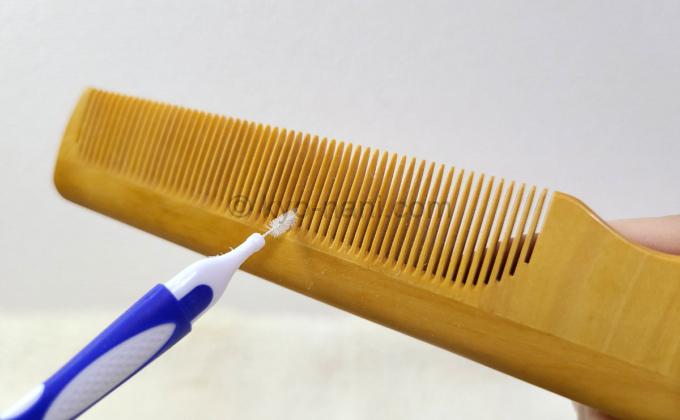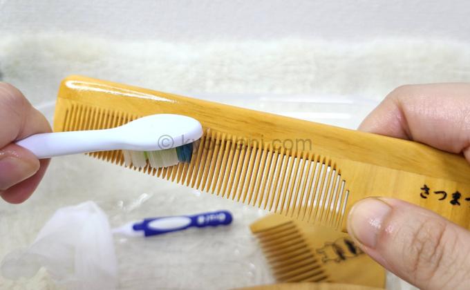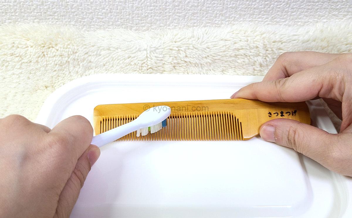私はいつも容器の蓋の上に櫛を立てて、歯の根元から歯先に向かってサッサとかるーく掃くようにお掃除しています。