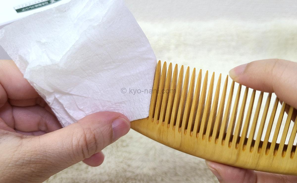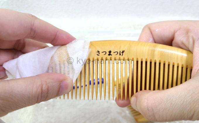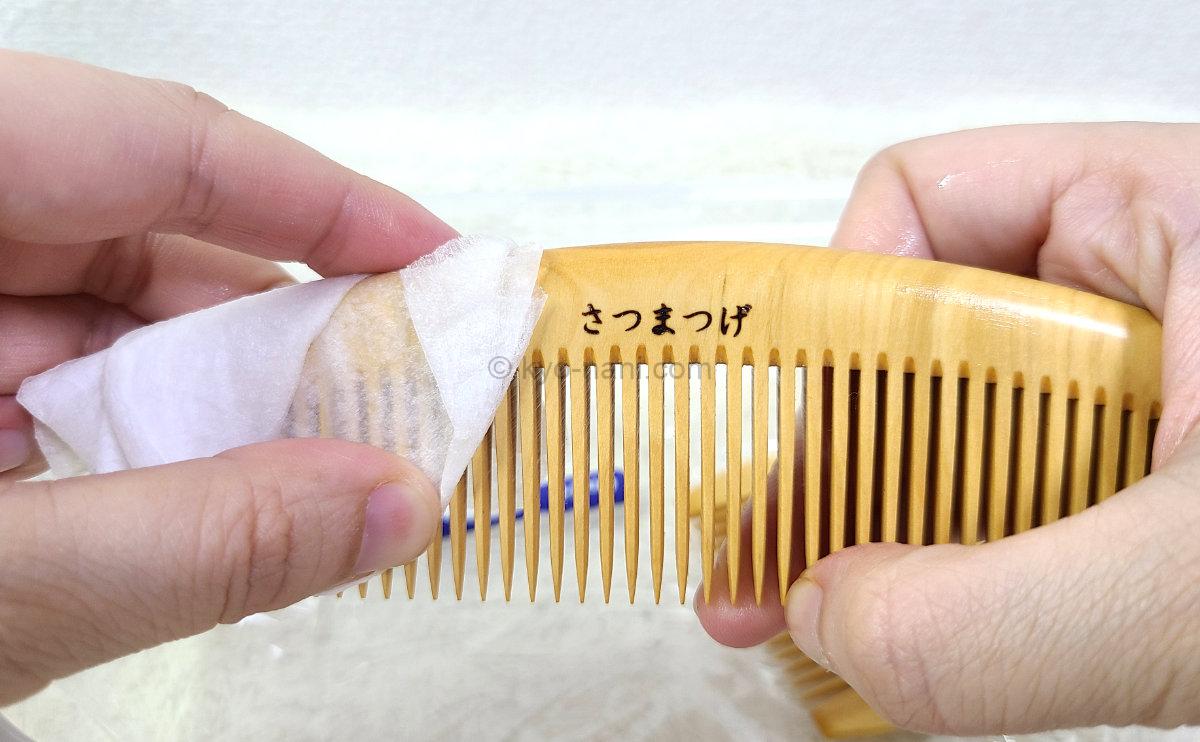 さああとはつげ櫛にたっぷり付いた椿油をしっかり拭くだけ!