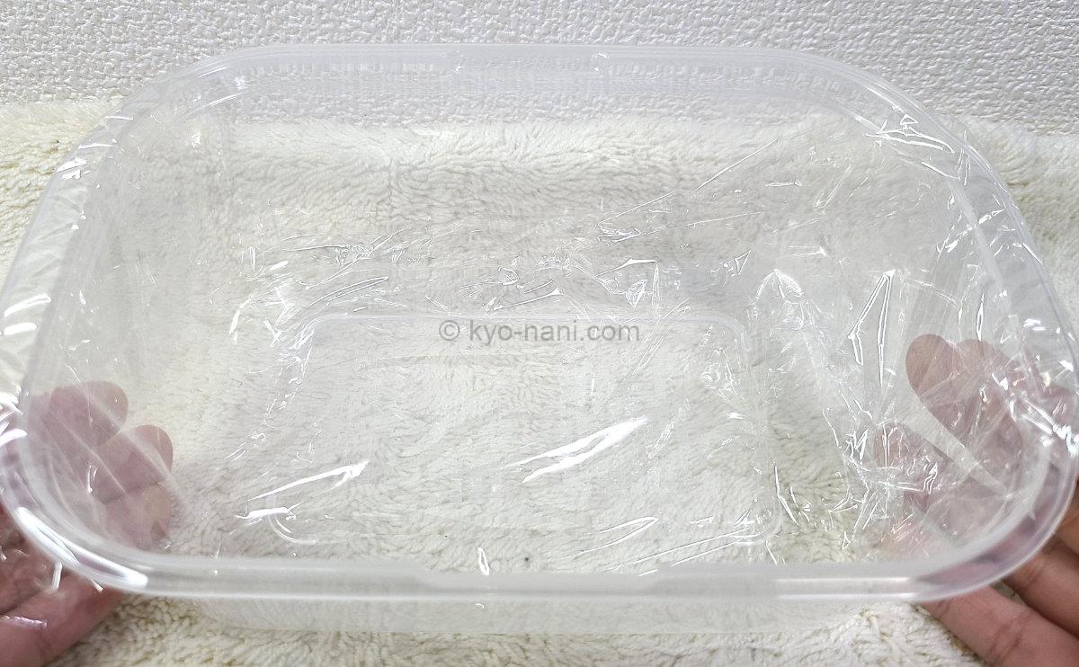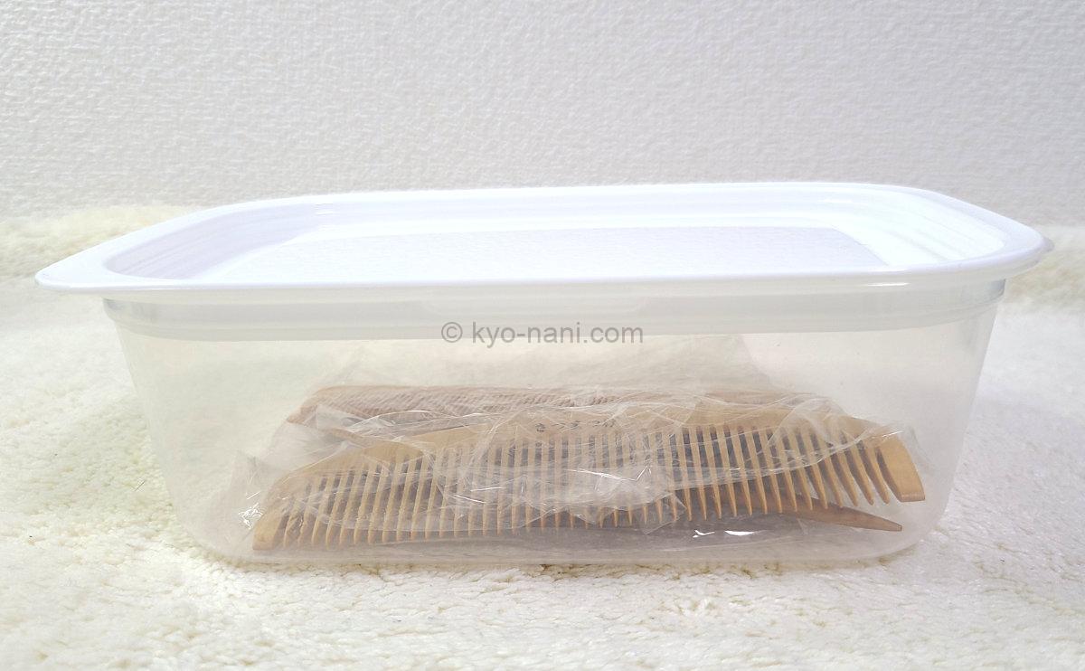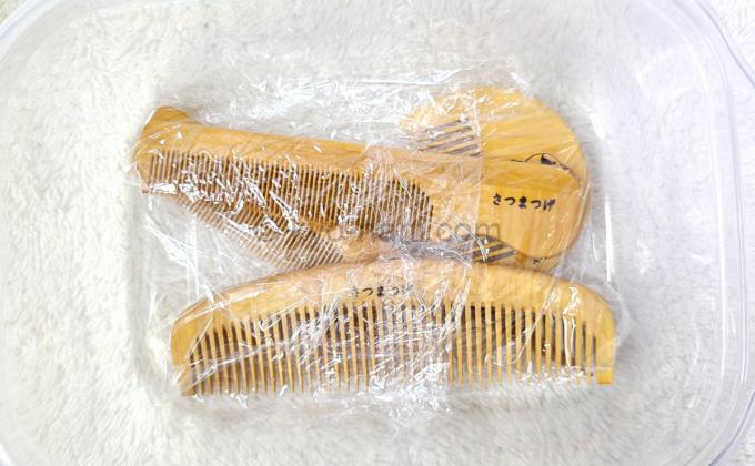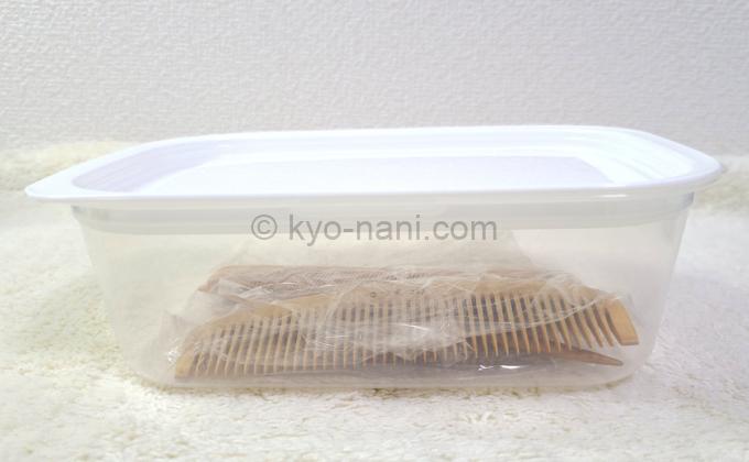 すべての櫛に椿油を塗り終えたら、容器に入れて、ラップで包みます。