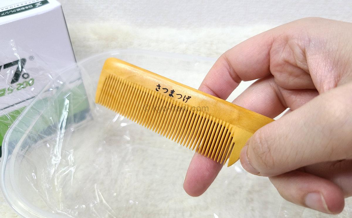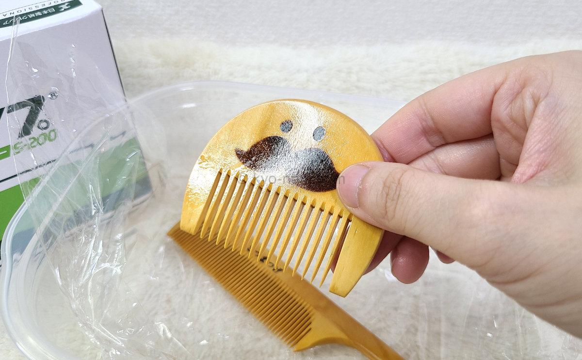 何年も手入れせず、櫛が割れそうなくらい乾燥している…なんて場合の処置には有効なのかもしれませんが、普段からお手入れしている櫛の場合は、潤いを通り越してべたつきそうだな…と思いました。